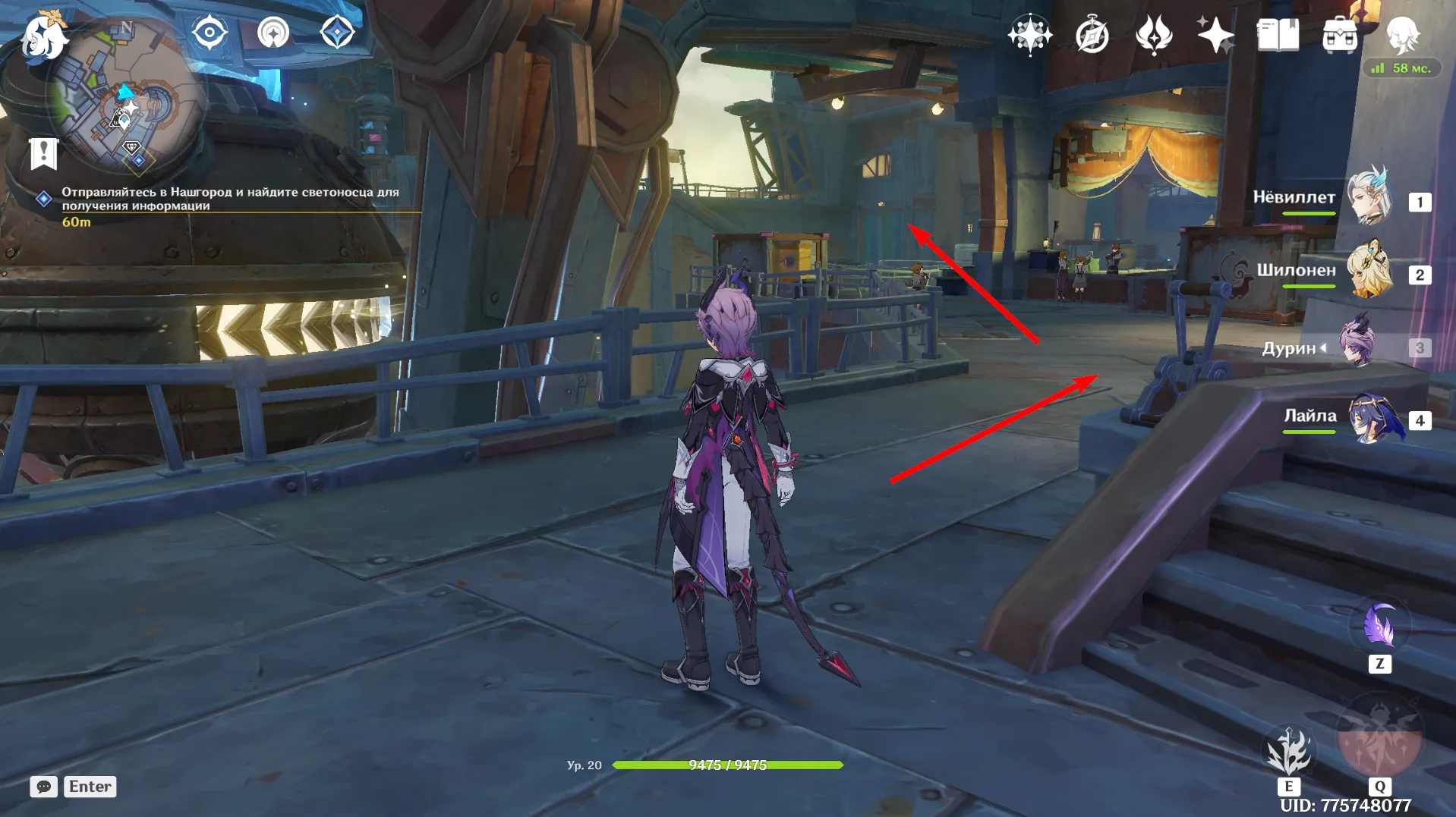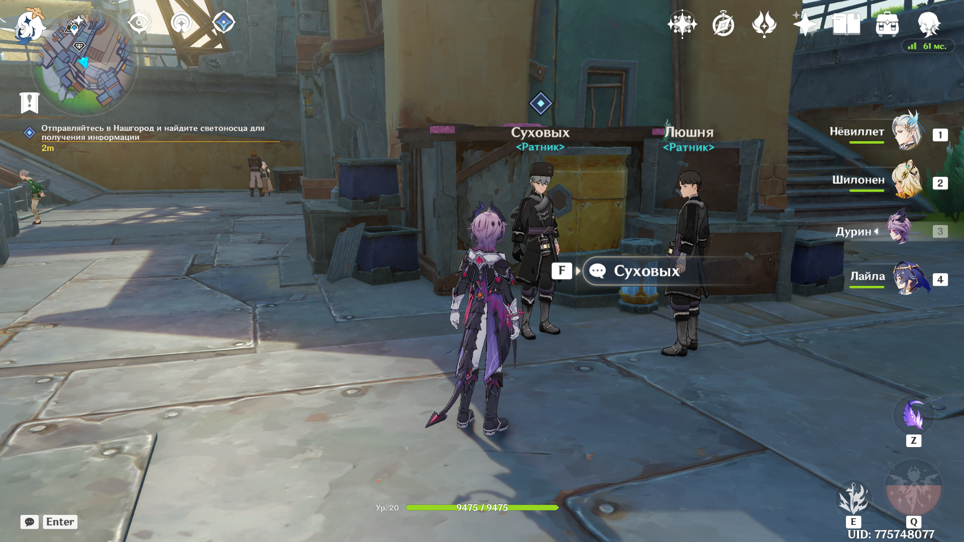 Когда вы получите все три артефакта, Паймон предложит разузнать о таинственном светоносце Сигурде в Нашгороде, опросив его возможных коллег. Воспользуйтесь телепортом у Куратории тайн и спуститесь на лифте вниз. После чего поверните направо, минуя Гильдию Войнича, и наткнётесь на двух мужчин в фирменной чёрной форме.